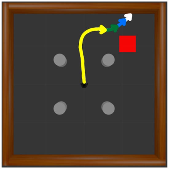 In reinforcement learning, the common approach to collecting training data is to store transitions in a memory buffer. These transitions are generated after the agent performs an action. The learning process is initiated after a certain number of data transitions are accumulated in the memory buffer. In this process, finding the optimal policy is challenging due to the low probability of achieving the goal through exploration. This difficulty is exacerbated, especially in environments with sparse rewards. To address this issue, we implement the HER by re-evaluating failed episodes to create successful trajectories. Algorithm 1 illustrates the detailed process of implementing the HER. is a set of states to be re-evaluated as new destination states selected from failed trajectories. A failed episode occurs when the robot collides with walls or obstacles or experiences a timeout. In each failed case, HER is applied three times. In the case of a collision, the states corresponding to steps 5, 25, and 50 before the final state of the trajectory are designated as the new destinations. As shown in Figure 8, trajectories from the initial position to these new destinations are extracted. The white trajectory represents the original unsuccessful path, while the blue, green, and yellow trajectories signify new successful paths, each setting the state 5, 25, and 50 steps before as the updated destination. Rewards are then recalculated, contributing to the generation of successful experiences.