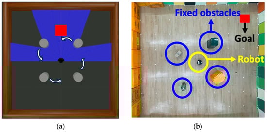 Given the nature of deep reinforcement learning, instances exist where discovering the optimal policy is not guaranteed, even within identical learning scenarios. This implies that under consistent configurations, the likelihood of identifying the optimal policy may fluctuate. To assess the robustness and reliability of the proposed methodology, the experiment was replicated ten times. To easily visualize the progress of policy optimization, the average rewards of the most recent 50 episodes were plotted and compared. To address the comparison challenge introduced by multifunctional reward shaping, the rewards obtained from all experiments were compared using the baseline reward system defined by Equation (13). In addition, following the completion of the learning phase, test-driving was performed using trained artificial neural networks. In this process, actions were determined without the addition of noise. Each driving test was conducted in both simulated and real environments. In detail, in Figure 10a, 100 episodes were conducted with the destination set randomly to the same settings as the learning environment in the simulation. In a real environment, as shown in Figure 10b, four fixed obstacles of different sizes are installed and one person acts as a dynamic obstacle that moves randomly. To test the adaptability of the optimal policy found by the proposed method, the actual environment is set up slightly differently from the learning environment, and the destination is set to each of the four corners of the space. We conducted a total of 20 test drives, with 5 tests for each corner.