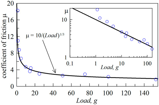 Dependence of the friction coefficient (μ) on load. Symbols: experimental data from [32]. Solid line: approximation (17). The inset to the figure shows the same dependence in logarithmic coordinates.