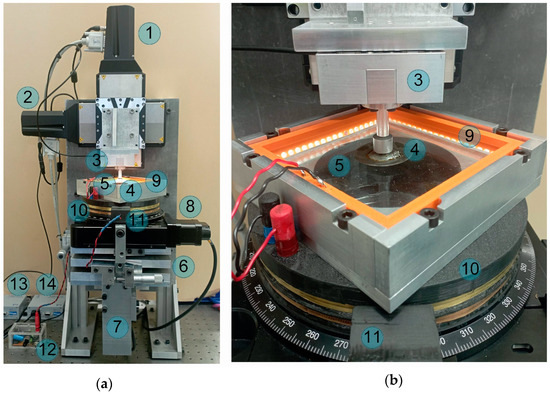 (a) a general view of the experimental setup; (b) close-up view of the contact area between the spherical indenter (4) and the elastomer (5) illuminated by a surrounding LED light (9), powered by a system of sliding contacts (10) and (11).
