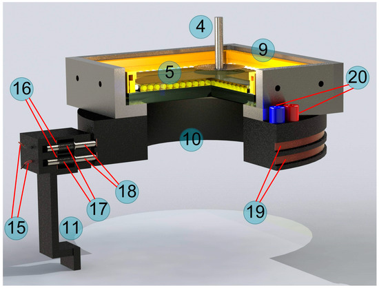 Here, the contact system is shown in section view, which allows us to trace the path of electrical energy transfer from the power supply unit (12) to the light frame (9). For convenience, Figure 3 shows the numbered elements, which are the same as used above in Figure 2; the new elements in Figure 3 continue the numbering order of Figure 2. Note that Figure 3 shows not a real photograph, but an accurate 3D model preserving all proportions. This 3D model was used to manufacture the installation elements (10) and (11) that were printed out with the “QIDI TECH i Fast FDM 3D Printer”. The electric current from the power supply (12) is transferred to the brass foil plates (16) via cables (15). These plates are in contact with the steel pins (18) through springs (17). Through contact, the pins transmit an electrical current to the metal rings (19), which are electrically connected to the sockets (20). The light frame (9) is connected to the sockets (20) (see Figure 2b). The springs (17) are needed to press the pins (18) against the conductive strips (19) to ensure stable electric sliding contacts. A total of 4 pins are used in the system to ensure reliable contact: 2 for each contact strip. In this case, the cross-section in Figure 3 shows only two pins, each corresponding to different contact strips. Note that the metal strips (19) in the real photograph in Figure 2 have different colors as they are made of different materials: brass (top) and copper (bottom). Initially, different materials were used to determine which was best suited to provide a reliable electrical contact. However, since both materials showed good contact properties, there was no need for further modification of the sliding contact pairs.