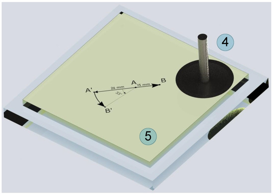 The indenter trajectory in this scenario is shown in Figure 4 as A’B’. To ensure that in the experiment with elastomer rotation the indenter passes the same path as in the experiment with linear motion along the trajectory AB, the equality AB = A’B’ must be satisfied, which is obtained when the elastomer is rotated by the angle of