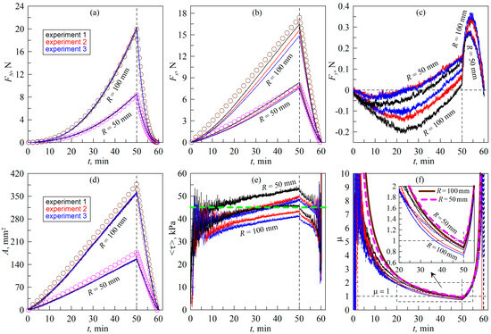 Dependences of the normal (FN) (a), tangential (Fx) (b) and lateral (Fy) (c) contact forces, contact area (A) (d), average tangential stress (e) and formally defined friction coefficient (f) on time (t). In the figure, the dependencies corresponding to the indenters with radii of R = 100 mm and R = 50 mm are labeled. The figure corresponds to the experiment with torsion of the elastomer when the indenter moves only in the normal direction. The layout of the experiment is shown using trajectory A’B’ in Figure 4. A Supplementary Video is also available (Video S2).