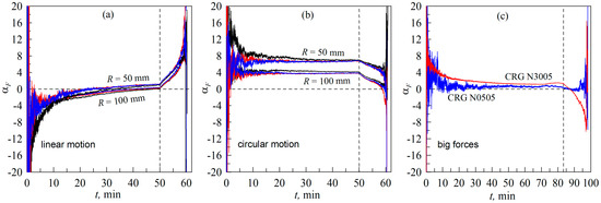 to the direction of the movement of the indenter. In experiments in which there is no lateral movement of the indenter, the lateral force (Fy) should be much smaller than Fx, while the angle αF, determined by Equation (21), should be close to zero. In the present paper, the behavior of the friction coefficient (μ) is studied, and it is known that it can depend on the evolution of the ratio between the magnitudes of the tangential and lateral forces (21), as was shown in [43]. Therefore, for completeness, Figure 6a shows the dependences of the angle αF(t) for all experiments, the results of which are shown in Figure 5. Based on this figure, the angle αF takes on large absolute values only at the initial stage of indentation and in the detachment phase, while in the main indentation phase this angle does not exceed the value of a few degrees.