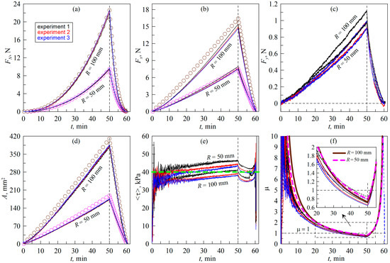 In all experiments, three force components and the time dependencies of the contact area (A) shown in Figure 5d were calculated. The contact area is determined directly from the experiment, since transparent rubber is used as elastomer and the contact area is clearly visible (see the description in Section 3 of the paper, as well as all Supplementary Videos). The availability of information about the contact area allows us to calculate the dependencies of mean tangential stresses <τ>. Since the lateral force (Fy) is present in the experiments, for greater accuracy in presenting the results, the tangential stresses <τ> and the coefficient of friction (μ) were determined as
