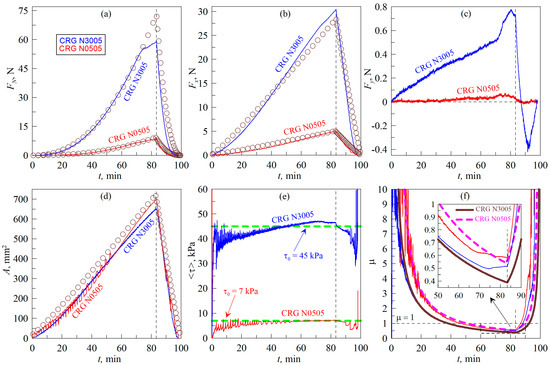 Dependences of the normal (FN) (a), tangential (Fx) (b) and lateral (Fy) (c) contact forces, contact area (A) (d), average tangential stresses (e) and formally defined friction coefficient (f) on time (t). In the figure, the dependencies corresponding to the elastomers CRG N3005 and CRG N0505 are labeled, and the indenter radius in both experiments was R = 100 mm. In panel (d), only the result of BEM simulations for material CRG N0505 is shown, because dependence for CRG N3005 is almost the same. The figure corresponds to the experiment with tangential displacement of the indenter, the layout of which is shown using trajectory AB in Figure 4. A Supplementary Video is available for the figure (Video S3).