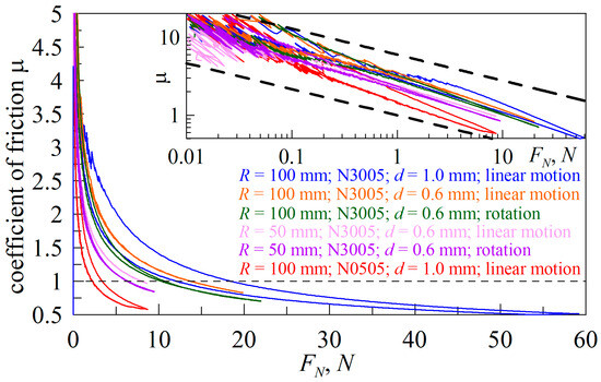 Figure 11 shows the experimental dependencies of the friction coefficient (μ) on the external load (FN) taken from the works of various authors [26,32,51,52,53,54,55,56,57,58,59,60,61,62]. Here, the upper dependences are the data from [32], previously discussed above and shown in Figure 1. To avoid misunderstandings, we note that in Figure 1 the mass in grams was plotted along the abscissa axis because the original data from [32] was shown, while Figure 11 shows the dependence of the friction coefficient on the external force expressed in Newtons.