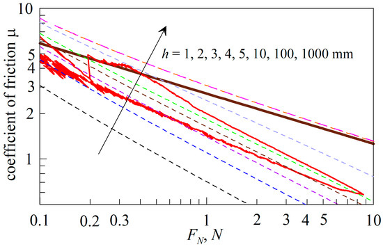 Dependences of the friction coefficient (μ) on the external normal force (load) (FN). The dashed dependencies show the results of BEM simulations when indenting an indenter with a radius of R = 100 mm into an elastic substrate with parameters E = 0.042 MPa, ν = 0.48, Δγ = 0.0175 J/m2, which correspond to the material CRG N0505. The dashed curves from bottom to top (8 curves in total) correspond to cases with increasing elastomer thickness (h); the thickness values are shown in the panel of the figure. The brown bold line shows the dependence following a power law (17), obtained at τ0 = 7 MPa and the elastic parameters mentioned above. The red solid line of smaller thickness shows the results of the experiment on the indentation into CRG N0505 material (see Figure 8).