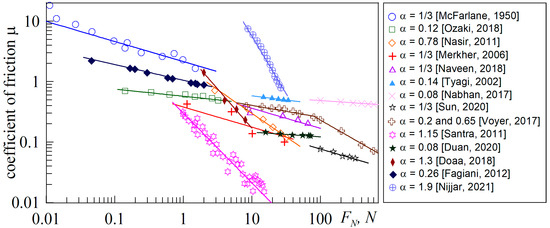 Dependences of the friction coefficient (μ) on the external normal force (FN). Symbols represent experimental data from [26,32,51,52,53,54,55,56,57,58,59,60,61,62], solid lines show the exponent approximations , where the value of the exponent α for all straight lines are given in the figure panel with a reference to the source with the corresponding experimental data.