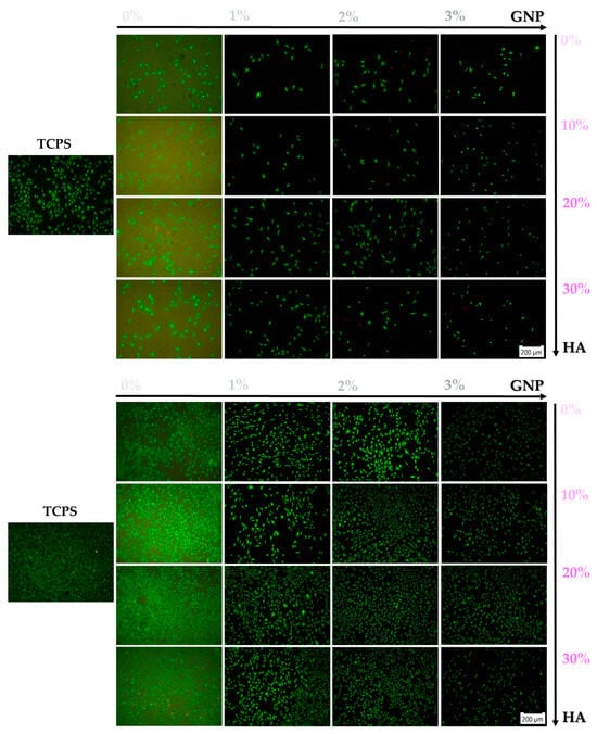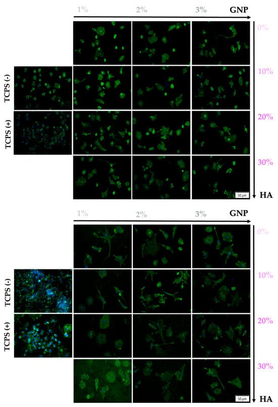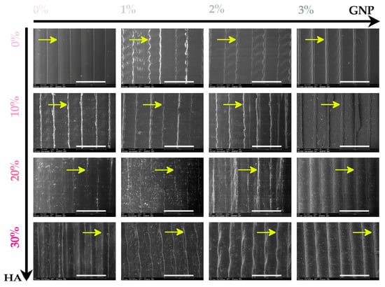 - The conversion from smooth to slightly rough surfaces was observed at higher HA ratios, leading to the emergence of micrometric protuberances. Once the GNP amount reached the maximum value (3 wt.%) and the HA ratio was in the 20–30 wt.% range, a bulging effect occurred and was preserved along the printed lines, suggesting an improved material fluidity; yet, this aftereffect is not always adequate for a proper cellular response.