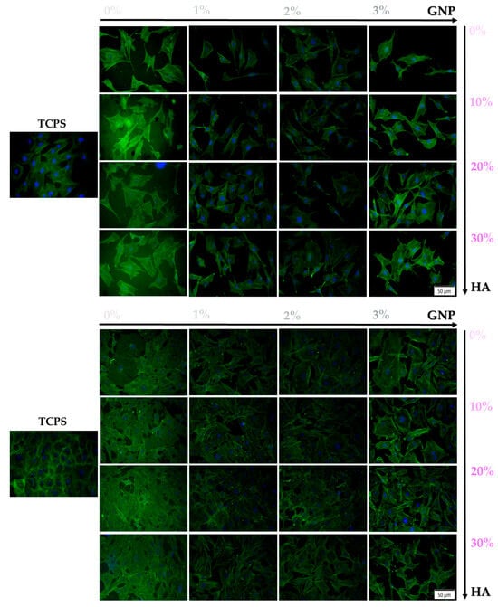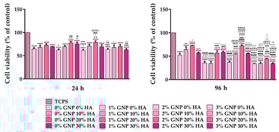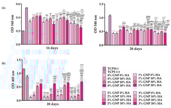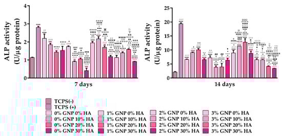 p < 0.01 vs. 3% GNP 20% HA). The TCPS (-) and TCPS (+) notations denote the negative and positive controls for pre-osteoblast differentiation, respectively.