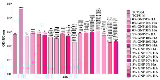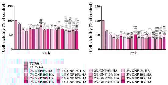 p < 0.001 vs. 3% GNP 20% HA). The TCPS (-) and TCPS (+) notations denote the negative and positive controls for pre-osteoblast differentiation, respectively.