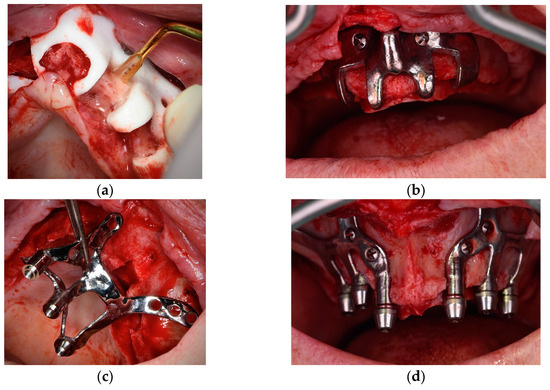 Figure 3. Surgical template used to remove the residual alveolar ridge. (a) Polyamide template. (b) Titanium alloy template. (c,d) CSI placement. - 2.9.
