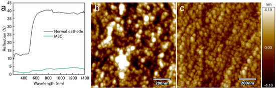 (a) Reflectance measurements of the gold-plated glass substrates. AFM images of a gold thin film interface deposited using (b) conventional magnetron sputtering and (c) M3C.