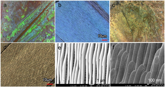 The SEM observations of the deposited samples revealed that the wing scales did not detach, and conductivity was imparted (Figure S1). Ridges and crossribs were arranged in a bridge-like structure to support the microwalls on the scale surface (Figure S2). These microscale grids were also visible behind the wall-like lamellae (Figure 4e), suggesting that the gold reached large depths into the complex structure, even in a magnetic-field-controlled environment. Furthermore, side-view observations of the deposited sample revealed the layered stack of scale lamellae in the linear structures (approximate thickness of 200 nm) that resulted in a superhydrophobic structure [26] (Figure 4f). Thin grooves were visible between the layers, indicating that particles can be deposited in the shaded areas of the 3D structure with a certain degree of wraparound motion.