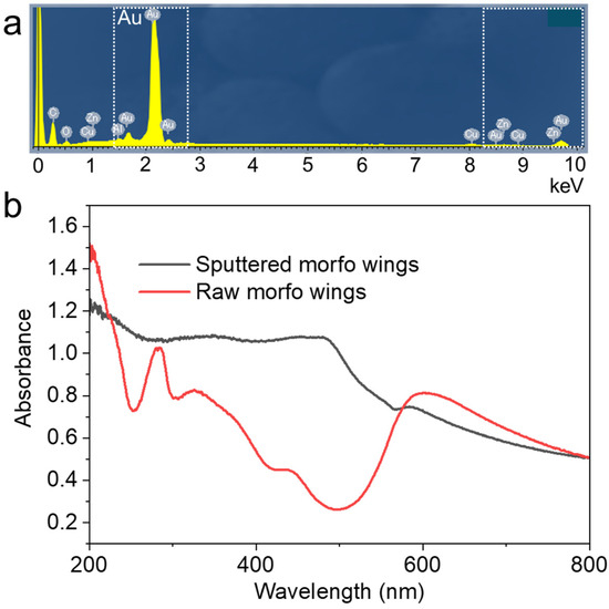 Elemental analysis was conducted on the surface by EDS to verify that the observed image was that of the deposited sample (Figure 5a). Gold exhibited the strongest peak in the elemental analysis. Carbon, copper, and zinc were also detected. The presence of carbon can likely be attributed to the thinness of the gold film, which was only 100 nm; therefore, elements from the morpho butterfly itself were observed. The optical properties of the butterfly wings were also assessed (Figure 5b). The wings, prior to deposition, exhibited an absorbance peak at 280 nm, indicating their protein composition [27,28]. The absorbance was lower in the range of 400–500 nm, suggesting the reflection of blue wavelengths [29]. After deposition, blue wavelengths were no longer reflected, and an absorbance peak at 500 nm, characteristic of gold nanoparticles, was observed [30]. Light must be reflected in the wavelength range of 400–500 nm to attain structural color; however, the strong light absorption of the gold nanoparticles before light entered the structure suggests that the film is unlikely to appear blue after deposition. As the purpose of this study is to observe, it was not assumed that the optical functionality would be maintained. However, functionality can be maintained by ensuring that the deposited metal is less than 100 nm thick and has insufficient blue-light absorbance.