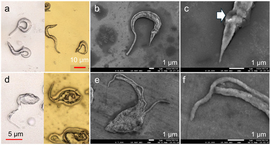 Gold deposition was performed on T. cruzi to demonstrate imaging not only on dry-state samples but also on fixed and preserved water-rich microbial samples. The interface was imaged using laser microscopy before and after low-temperature deposition on Trypo (Figure 6a). No structural deformations were observed after deposition from the tip of the flagellum to the bumpy appearance of the kinetoplast. This suggests that gold deposition occurred without affecting the surface structure of the formalin-treated protozoa. The effectiveness of low-temperature deposition on biological samples for observation testing was confirmed by examining the gold-deposited Trypo using high-magnification SEM as a visualization method (Figure 6b). A flagellum observed as a fin-like edge in the laser microscopy image can be observed as a smooth rod along the cell body in the SEM image. The texture of the flagellum is distinct from that of the cell body, suggesting that the roughness on the cell body is not ascribed to the grain formation of gold nanoparticles but actually reflects the cell texture itself. The posterior tip of the cell had dimensions in the order of nanometers and was thinner than the tip of the flagellum (Figure 6c). The dent near the bumpy kinetoplast likely marks the position of the flagellar pocket, or possibly reflects a minor damage caused by the coating process (Figure 6c, arrow)