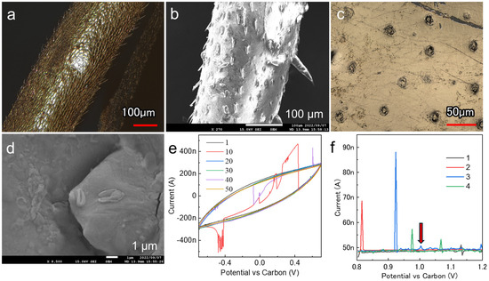 (a) Laser microscopy image of a leg after deposition. (b) High-magnification SEM images of a molted leg. (c) Laser microscopy images of the pore channels on the exoskeleton surface. (d) High-magnification image of the spiracle of the exoskeleton after molting. Electrochemical measurements obtained using (e) CV and (f) DPV.