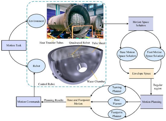 Therefore, this paper proposes a hierarchical planning method for the tube plate quadruped inspection robot. Utilizing an environment map constructed based on grid-based methods, the method designs the robot base motion planner, the robot base turning planner, and the gait motion planner, to enable the robot to move on the tube plate efficiently and safely. The task analysis and algorithm implementation framework are illustrated in Figure 1.