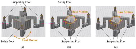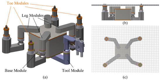 The structure of HIT_Spibot. (a) The motion modules; (b,c) denote the robot with four supporting feet.
