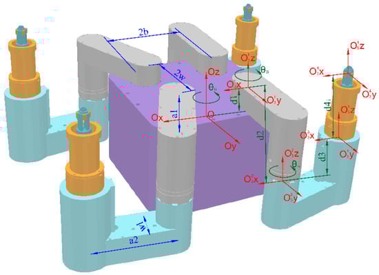 The robot base motion is driven by the contact forces between the feet and the tube plate. In the case of three or four supporting feet, the tube plate along with the fixed feet and robot base, we formed a 3-degree-of-freedom (DOF) parallel robot, as depicted in Figure 4b,c. Assuming the positions of the three supporting feet relative to the base are denoted as , , and , the simplified inverse kinematics formulas for the rotation angles and of each foot, are given as follows.