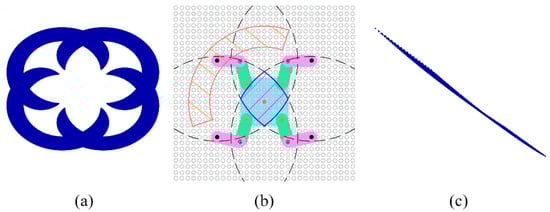 According to the forward kinematic Equation (1) outlined in Section 3.2, a Monte Carlo method was employed to generate numerous random combinations of joint angles within the specified ranges for each leg of the robot while fixing the position and orientation of the robot’s base. The positions of the four feet were computed, and each corresponding configuration of joint angles was examined for potential self-collisions. Valid foot positions were recorded, leading to the delineation of the robot’s foot workspace. For a given base pose, the actual foot workspace is illustrated in Figure 5a, which is intersected by two lines, presenting a ring-shaped area as depicted in the orange-shaded region in Figure 5b. Similarly, using the inverse kinematics Equation (2) from Section 3.2 and the Monte Carlo method, a multitude of base positions were randomly generated within the quadrilateral formed by the four fixed foot positions. The joint angles of the robot were then calculated, checking for solutions and verifying whether these solutions fell within the respective motion spaces while also ensuring that no self-collisions occurred. Valid base positions were documented, resulting in the representation of the base’s workspace. For a specified robot feet position, the actual base workspace is depicted in Figure 5c, which is in the region formed by the intersection of four or three circular rings, as shown in the blue-shaded region in Figure 5b.