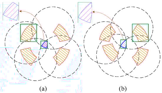 We adopted minimum bounding rectangles to represent the workspaces of the robot base and feet. The foot workspace’s bounding area was necessarily a truncated ring. By considering the four endpoints of the truncated ring and the tangents of each circle, the foot workspace bounding rectangle could be determined. As for the base workspace, its bounding area was necessarily formed by the intersection points of three or four circles. By considering these intersection points and the tangents of each circle, the base workspace bounding rectangle could be determined, as illustrated in Figure 6.