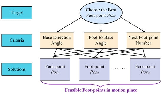 The objective of the base turning planning can be formulated as a Multi-Criteria Decision-Making (MCDM) problem. The most commonly used method for solving MCDM problems is the TOPSIS method, which is a multi-criteria approach that determines the optimal solution from a finite set of alternatives by minimizing the distance to the ideal point and maximizing the distance to the worst point []. The TOPSIS method is mathematically simple and offers flexible selection []. In this section, the base turning planning was based on the TOPSIS algorithm, and the process is outlined in Algorithm 1. Here, n represents the number of landing points to be evaluated, i denotes the landing point index, and the termination condition minimizes the angle between the orientation and the given direction while ensuring uniform distribution of the four feet.