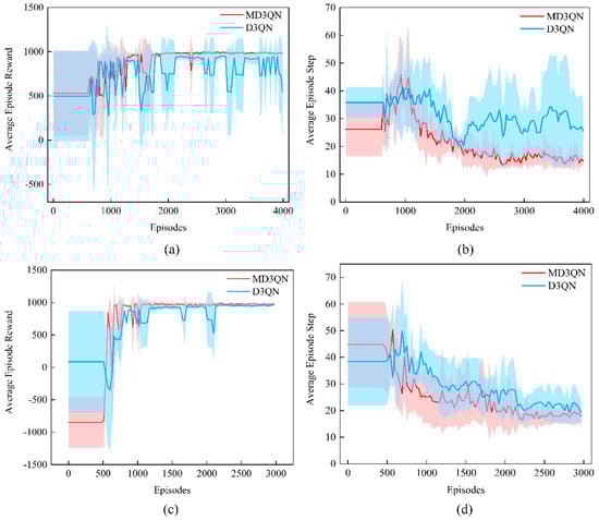 Figure 11 illustrates the training results for Square-1 and Triangle-1. Each curve represents the mean and variance of training scores over a specified number of rounds using five random seeds for an environment-task combination. Due to the higher exploration of ineffective routes by the D3QN algorithm in the early exploration phase, the likelihood of finding the optimal route within a limited number of rounds was lower, resulting in poor convergence and lower final scores. Under the same exploration conditions, the MD3QN algorithm could learn a control strategy with higher stable scores, as well as better convergence effectiveness.