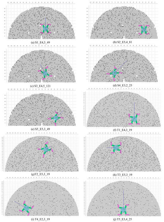 Using the models trained in Section 4.4, five sets of experiments were conducted by randomly adding obstacles to the environment. We used four metrics to assess the performance of the planning: Average Success Rate (ASR, the probability of successfully reaching the goal without encountering obstacles; higher is better), Average Episode Reward (AER, the average total planning score of the five-model experiments; higher is better), Average Episode Step (AES, the average total step difference of the five-model experiments; lower is better), and Average Episode Stable Reward (AESR, the average stable score of the five-model experiments, constantly non-positive; higher is better). Figure 12 illustrates one random obstacle environment and task among the 10 sets of models for S1–T5.