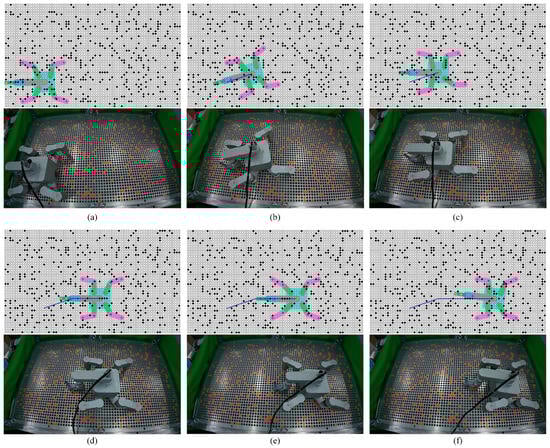 Simulation and practical comparison of the robot’s movement on the tube plate. (a) The initial state. (b) The robot reaches the end of the first segment of the path. (c) The robot turns. (d,e) The robot moves along the second segment of the path. (f) The robot reaches the target.