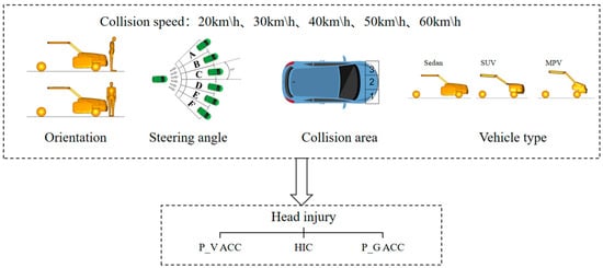 Based on the previous analysis, it is evident that the head injuries of pedestrians are influenced by the steering angle of the vehicle and the relative position difference between the pedestrian and the vehicle. Therefore, the simulated accident cases can be classified and discussed based on the different steering directions and relative positions between the pedestrian and the vehicle.