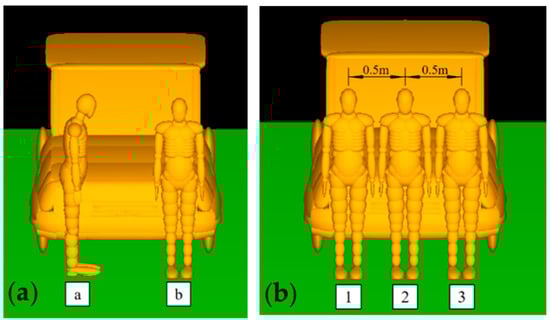 Based on this research, this article divides the relative orientation of pedestrians and vehicles into two categories: pedestrian side to vehicle “a” and pedestrian back to vehicle “b”. As shown in Figure 3. To better define the contact location between pedestrians and vehicles, Wang et al. [] divided the vehicle into 16 collision zones to better study the deformation characteristics of each part during vehicle collisions. In this study, the front part of the vehicle was analyzed for collisions. Therefore, the front part of the vehicle was divided into three regions: the left side, right side, and middle collision regions. By defining the relative orientation of the pedestrian and the vehicle, as well as dividing the front collision area of the vehicle into different regions, it is possible to define the relative motion state between the pedestrian and the vehicle before the collision occurs. As shown in Figure 3. To simulate a wide range of collision conditions, five different collision speeds were considered for each pedestrian position and vehicle type. Collision simulations were conducted for these five vehicle speeds ranging from 20 km/h to 60 km/h to replicate the typical range of collision speeds in pedestrian accidents [,]. Due to the lower survival rates for pedestrians in high-speed collisions, this study did not discuss high-speed collisions.