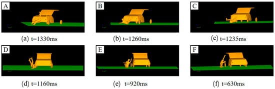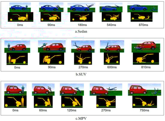 This collision process is similar to the collision stage described by Murano []. As shown in Figure 9, the collision simulation process caused by the vehicle turning left or right when the pedestrian is located on the right front of the vehicle is illustrated. The collision speed is 40 km/h, and the vehicle’s turning angle is the same in magnitude but opposite in direction. The figure shows a schematic diagram of the collision motion process captured at the same time.