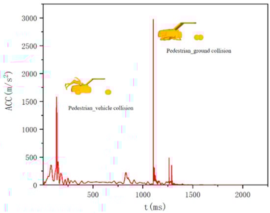 When assessing the risk of pedestrian injuries, particular emphasis is placed on evaluating head injuries. We use the Head Injury Criterion (HIC) for damage analysis based on head kinematics. By simulating the collision process and combining it with HIC standards, the severity of pedestrian head injury can be analyzed [,,]. Research shows that the maximum head rotation acceleration is closely related to brain injuries, and injury criteria based on head rotation kinematics have been proposed to assess the risk of head injuries. However, the application of these standards is still limited to the research field. In comparison, the maximum resultant linear acceleration of the head’s center of gravity (CG) and HIC based on linear acceleration (acceleration magnitude and duration) have been used for many years in vehicle safety standards []. HIC estimates the severity of head injury by correlating the effective deceleration of the head during the impact process. The mathematical definition of HIC is: