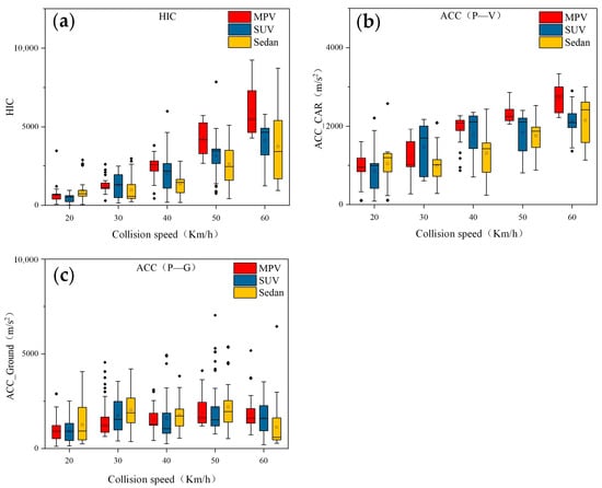 HIC and ACC box plots caused by three vehicle models at different speeds: (a) HIC; (b) peak human-vehicle acceleration; (c) peak human-ground acceleration.