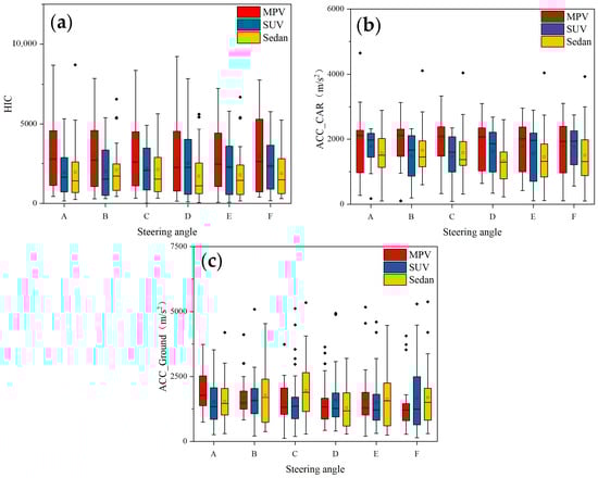 HIC and ACC box diagram caused by three vehicle models under different steering conditions: (a) HIC; (b) peak human-vehicle acceleration; (c) peak human-ground acceleration.