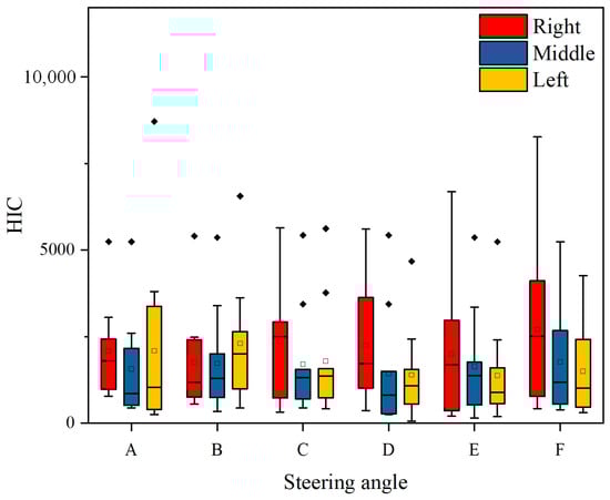 Figure 10 shows the influence of different turning measures by a sedan on the HIC value of head injury when a pedestrian is located at different positions in front of the vehicle. In this figure, A, B, and C represent the vehicle turning right, with turning angles A > B > C; D, E, and F represent the vehicle turning left, with turning angles D < E < F. The three situations represent the pedestrian located in different positions in front of the vehicle, namely, on the right front of the vehicle, in the middle of the front of the vehicle, and on the left front of the vehicle.