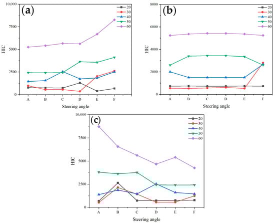 (a) The Effect of Steering Angle on HIC when pedestrians on the left side of the vehicle (Sedan); (b) The Effect of Steering Angle on HIC when pedestrians on the left side of the vehicle (Sedan); (c) The Effect of Steering Angle on HIC when pedestrians are located in the middle region of vehicles (Sedan).