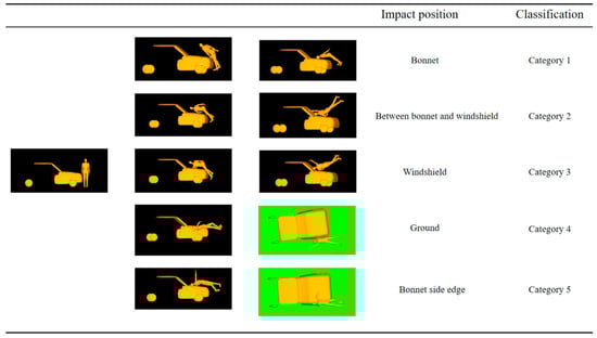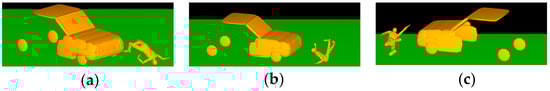 In this study, although vehicle steering may cause differences in the initial collision position between the pedestrian’s head and the vehicle, overall, the head still collides with the front windshield/hood of the vehicle. Therefore, the impact of the steering angle on the collision is relatively small. After the initial contact between the person and the vehicle, the vehicle is still in the deceleration phase. The pedestrian moves along with the vehicle. When the vehicle stops moving, the pedestrian lands due to the inertia generated by the collision. Due to the differences in the vehicle’s steering angle and the pedestrian’s position, there will be variations in the landing time and posture of the pedestrian, as shown in Figure 8. This leads to significant differences in the extent of injuries.