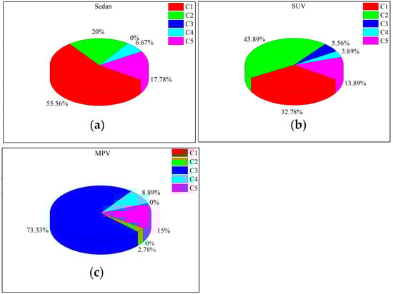 Percentage of collision categories for three vehicle models. (a) the proportion of each type of sedan collision; (b) the proportion of each type of suv collision; (c) the proportion of each type of MPV collision.
