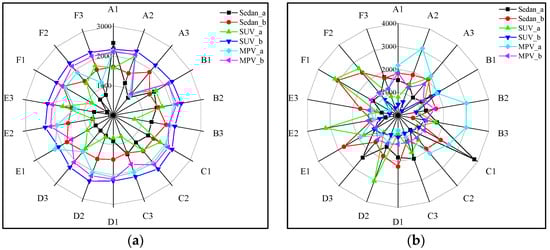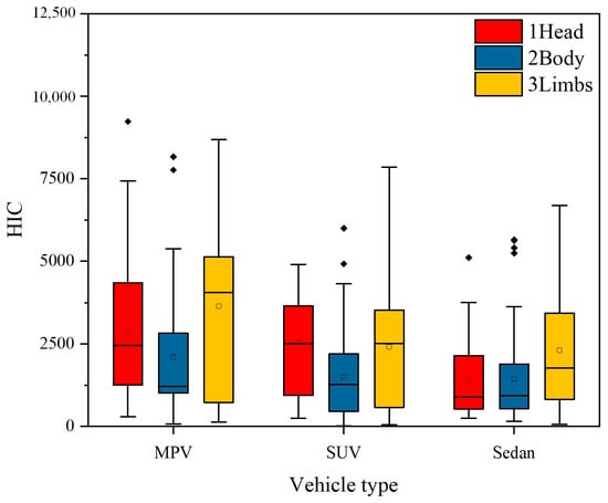 As shown in Figure 6, it can be seen that the collision damage caused by MPVs is relatively high, while the damage caused by sedans and SUVs is relatively small. The difference in collision damage may be due to the different front-end structures of the vehicles. The bumper height of the MPV is higher than that of the other two models, so when colliding with pedestrians, the collision point between the pedestrian and the vehicle is also higher than other two models. The difference in the contact point between the front end of the vehicle and the pedestrian results in different injury patterns for pedestrians.