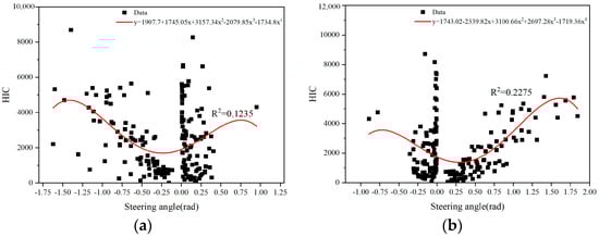 However, due to the varying collision speeds, we applied the same braking measure during the case simulation. As a result, there may be differences in the vehicle’s steering angle due to the braking action. Regarding this, we conducted a nonlinear fitting analysis between the simulated final steering results and the HIC values of head injury for pedestrians. The results are presented in Figure 17.