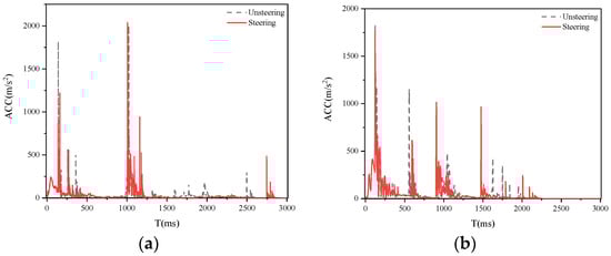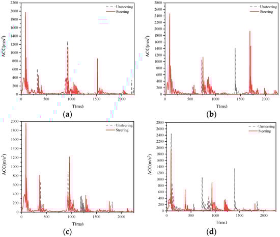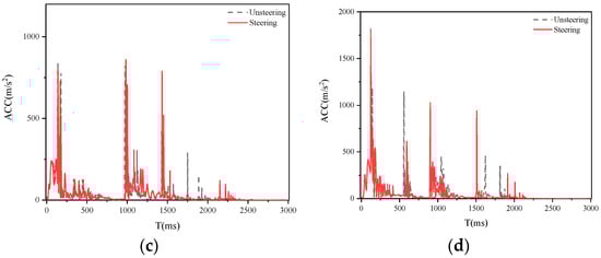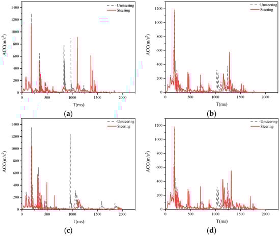 Collision acceleration curve generated by MPV turning at 0.28 rad. (a) Right-a; (b) Right-b; (c) Left-a; (d) Left-b.