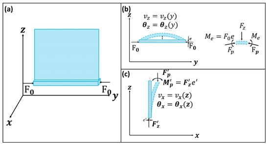 As shown in Figure 2, let us consider a model composed of a beam and a lobe fixed on the beam, where the beam bends under the external force . Due to the asymmetric structure of the model, as shown in Figure 1d,e, there is an eccentric distance , and the bending and buckling might happen at the same time in the model. First, the deformation of the beam and rotation angle can be calculated before buckling of the beam.