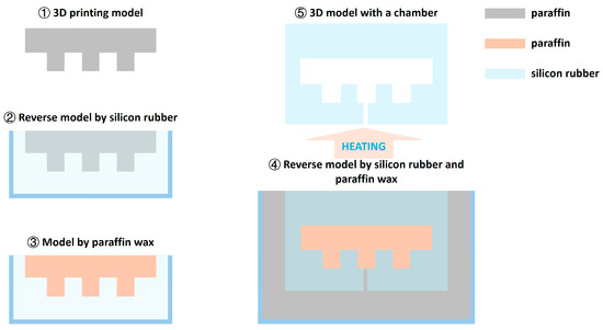 As shown in Figure 4, the physical models with a chamber were fabricated using silicon, and paraffin was used as the sacrificed material. In Step 1, the same model for the chamber shape was prepared using 3D printing (material extrusion-based 3D printing with Flashforge Creator 3 Pro; material: polylactic acid). In Step 2, the model from the previous step was reversed using silicon. In Step 3, melted paraffin wax was poured into the model from the previous step. In Step 4, a 3D printing model designed for the final structure was reserved using the silicon and paraffin model from the previous step. In Step 5, this reversed model was heated to melt wax in the structure. Once the wax was melted, it outflowed from the structure.