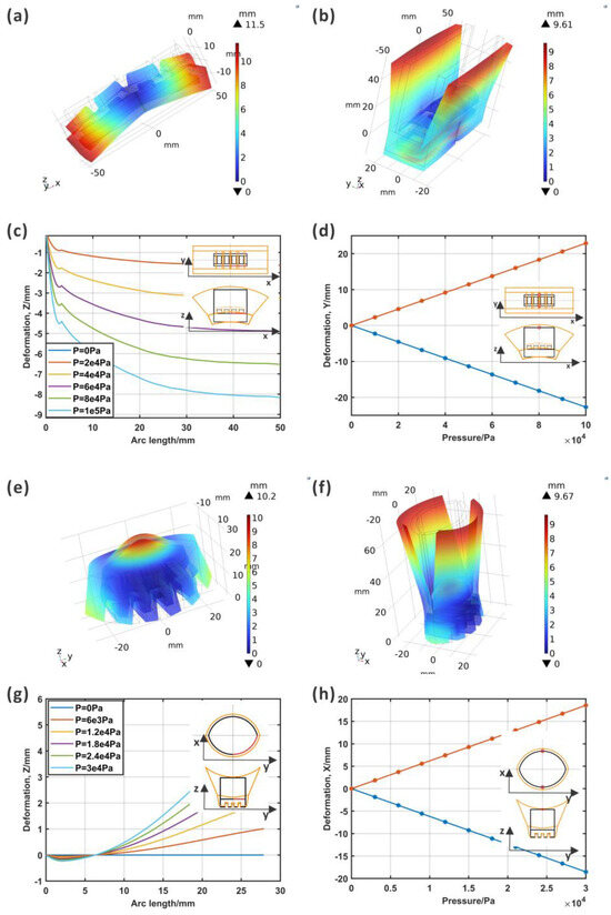 First, to calibrate the parameters of the material, a cube with a chamber was simulated and fabricated. The deformation was compared to ensure the precision of the computational model. As shown in Figure 3a, the cube’s dimensions were and those of the inner chamber were . The deformation result is shown in Figure 3b and indicates that the material’s parameters were . All the computational models adopted these parameter values. The meshed computational models of the ABP and AWP are shown in Figure 2c,d, respectively. Both actuators were fixed at the central line of the midrib to ensure symmetrical motion.