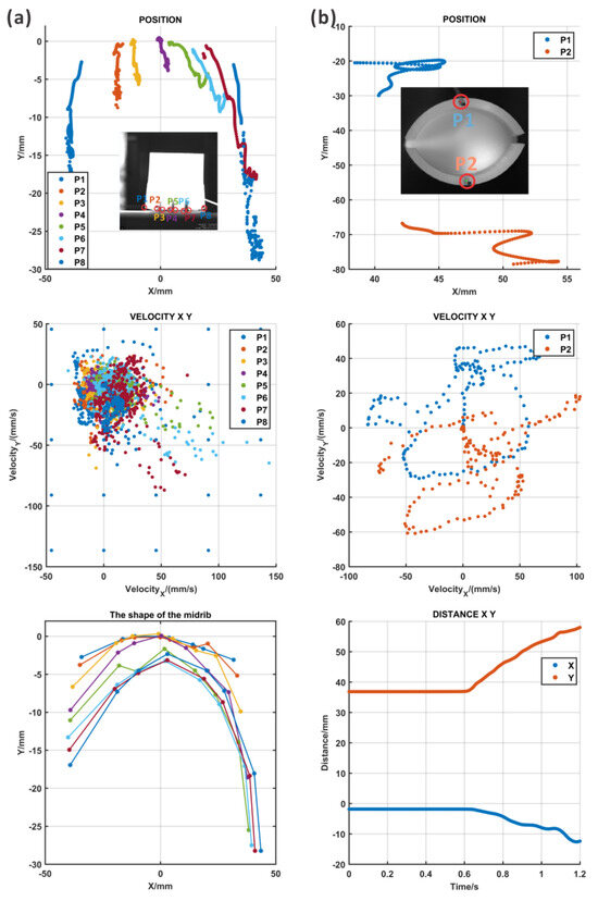 The motion tracking results for the AWP as determined from a top view with a high-speed camera. (a) The first column: the marking points in the midrib and their movement paths, the composite velocity, and the shape of the midrib; (b) the second column: the marking points in the lobes and their movement paths, the composite velocity, and the distance between two lobes.