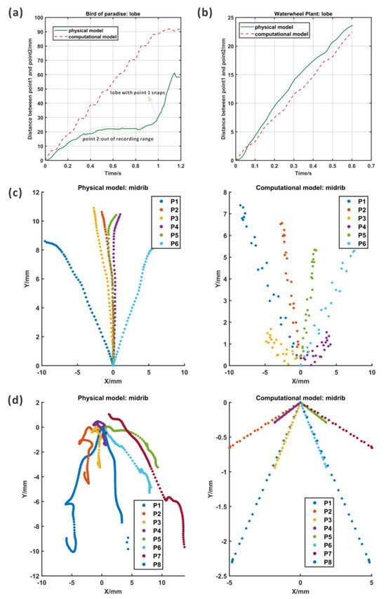 For the ABP, as shown in Figure 9a, the deformation of two points on the lobes increased with pressure, which was coordinated with the trend that the distance between two lobes in the physical model increased. The computational model moved smoothly, but the physical model opened one lobe first and the other lobe snapped a little. The distance was almost kept the same from 0.5 s to 0.8 s, which was because the tracked point was out of the tracking range of the camera. In addition, the motion of the midrib was compared as shown in Figure 9c. The deformation of points from the midrib spread, even though the deformation of the physical model was greater than that of the computational model. Considering that the computational model of the lobes had greater deformation than the physical model, there might be some incomplete conversion.