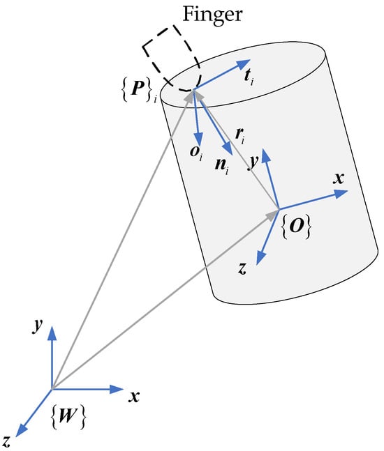 When a finger contacts an object, the centroid position is the origin of reference coordinates. The contact between the finger and the object is regarded as a mapping between the force exerted by the finger on the contact point and the torque formed around the center of mass [28]. Object coordinate systems are based on the centroid and a set of coordinate systems based on each contact position, as shown in Figure 1.